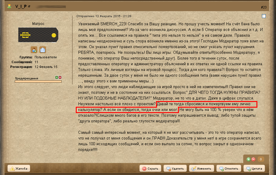 6. Ну и по поводу Вашей ссылки на п 8. Пока, я не создал ветку форума ответа от Администатора не было, а Оператор вообще поставил меня в игнор. Ответьте, что мне нужно было делать в данной ситуации. В какую дверь стучать! В очередной раз ответа на моё сообщение от Администратора нет уже более суток! Вот так к сожалению оперативно работает поддержка. А вот если б от меня был вопрос по поводу пожертвований (как я могу внести их или у меня не получается их внести), вот на данный вопрос ответ был бы в течении буквально нескольких часов. Это проверено на практике...